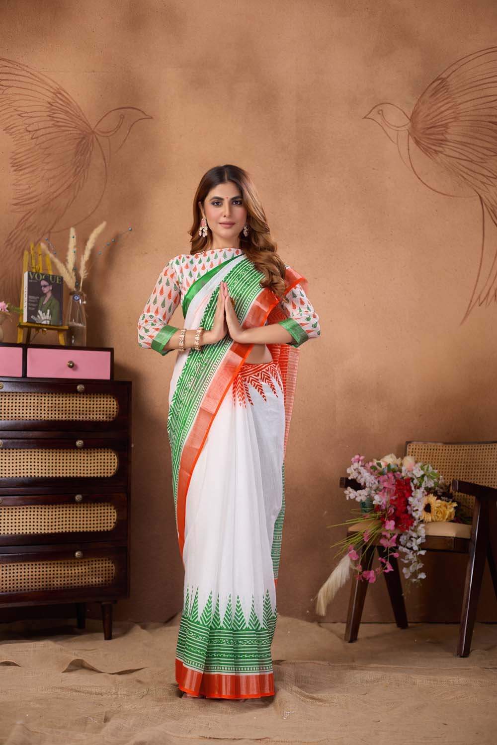 Crafted from premium-quality linen fabric, this saree is lightweight, breathable, and perfect for long hours of wear during Independence Day celebrations, school functions, office events, rallies, and cultural programs. The saree comes with a matching blouse piece, allowing you to complete the look effortlessly.